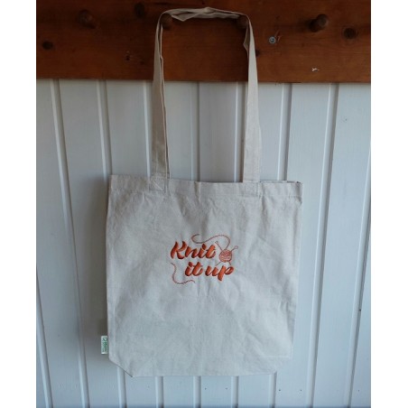 Brodeerattu vihreällä tai oranssilla tekstillä "Knit it up".
